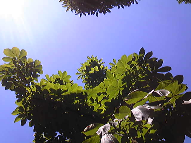 強い日光に思わず上を見ると、空の高いところまで延びた木の枝に